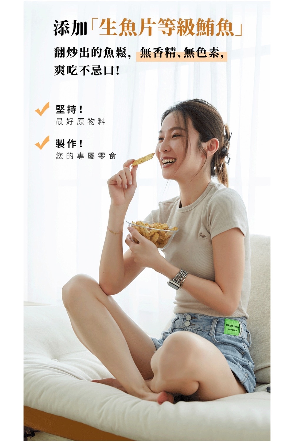【多多魚脆條】核心用料是頂級黃鰭鮪魚鬆,其無添加豆粉、無色素、無防腐劑,擁有最純粹的鮮美、輕盈酥脆的口感!