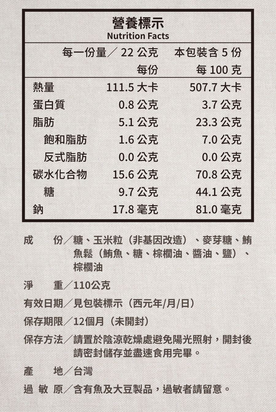 【多多魚爆鬆球】將深海鮮魚鬆和爆鬆球體完美結合,香氣十足的海味搭配恰美式焦糖,不一味追求口感脆度,而是著重細膩的鬆香滋味!鹹甜滋味口中穿梭,幸福感滿滿,令人不由一口接一口。